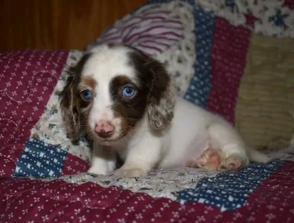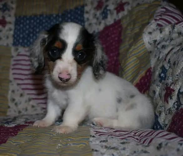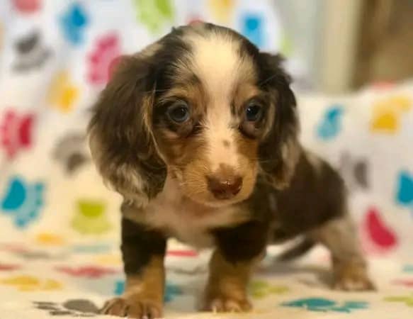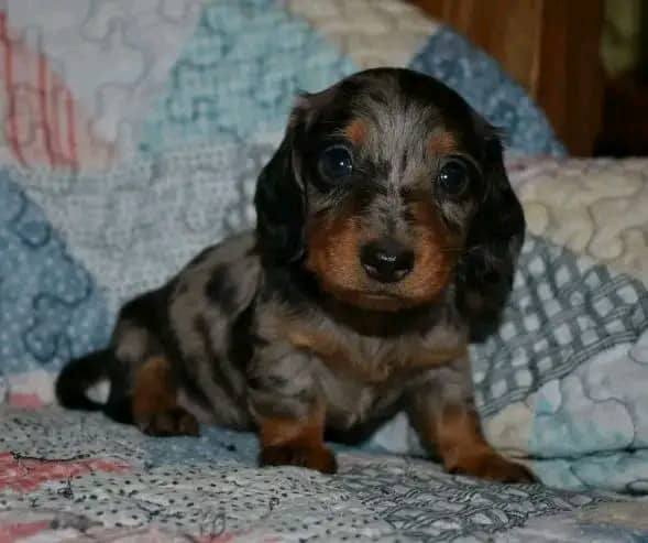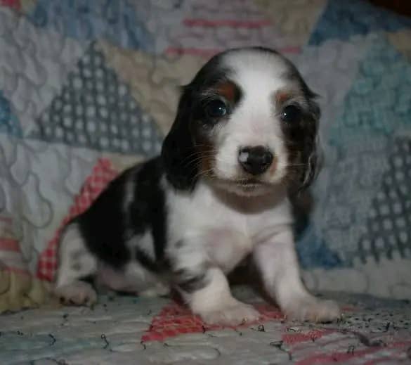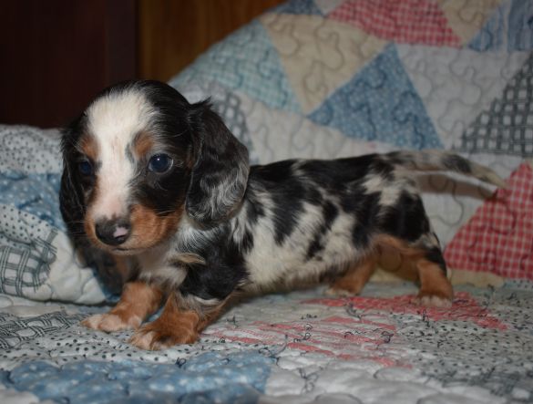 They call me "Maggie" I'm a short hair black and tan piebald with dapple markings female. I'm AKC Registered. My parents are Dolly and Dexter. I'm $850 with Limited Registration. With Limited Registration means that the dog is registered but No Litters produced by that dog are eligible for registration. For more information about me please Email Denise at contact@debbiesdachshundpuppies.com