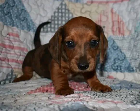 They call me "Ace" I'm a short hair chocolate based red male. I'm AKC Registered. My parents are Twizzler and Marley. I'm $1,000 On Sale for $850 with Limited Registration. With Limited Registration means that the dog is registered but No Litters produced by that dog are eligible for registration. For more information about me please Email info@debbiesdachshundpuppies.com